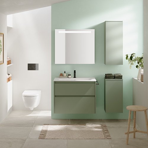 Die neuen Renova Plan Badmöbel überzeugen durch ein modernes, geradliniges Design und eine breite Auswahl an Farben und Oberflächen. Dazu zählt auch die Trendfarbe Salbeigrün seidenmatt.